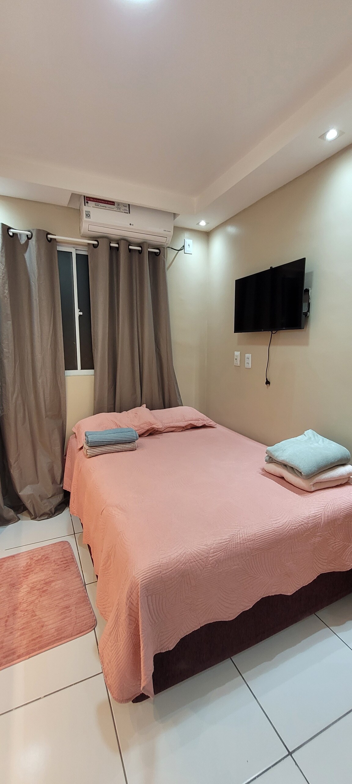 Espaço privativo, para estadias confortáveis e práticas. Conta com 1 suíte , equipada com: Cama de casal padrão com roupa de cama; Ar-condicionado; TV; 1Banheiro privativo. A acomodação é dividida em dois ambientes: Cozinha independente, equipada com os itens básicos para preparo de refeições. *Nao permite VISITAS; CRIANÇAS. *Não tem GARAGEM. *Check-In das 15h até as 22h,APENAS. *Wi-fi;o sinal está oscilando. Segurança: Envio do documento de identidade com foto dos hóspedes é obrigatório