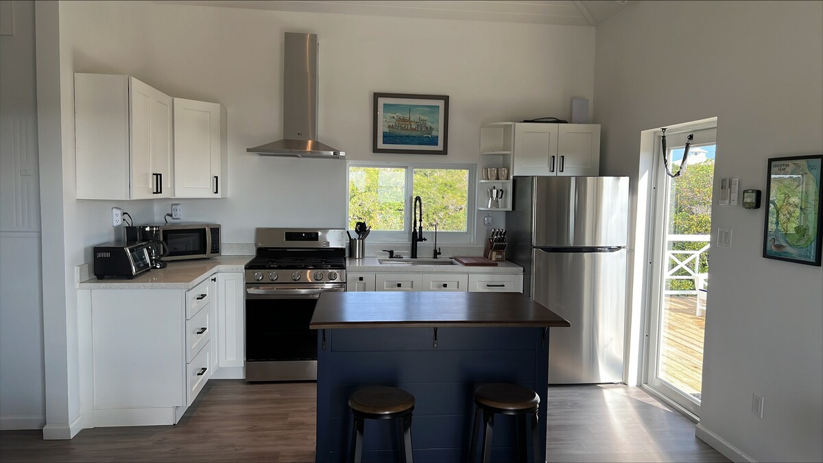 This new construction waterfront cottage has a 100ft Blue Hole in the backyard and overlooks a world class bonefish flat where you can watch them tail from the balcony. Built up on stilts, enjoy the countless shades of Exuma blues from every room and keep an eye out for the turtles in the lagoon! With 1 Bedroom and 1 Bathroom, you can comfortably sleep 4 people utilizing the pullout couch in the living room. Launch the kayak or paddleboard right from the backyard and enjoy the Exuma waters.