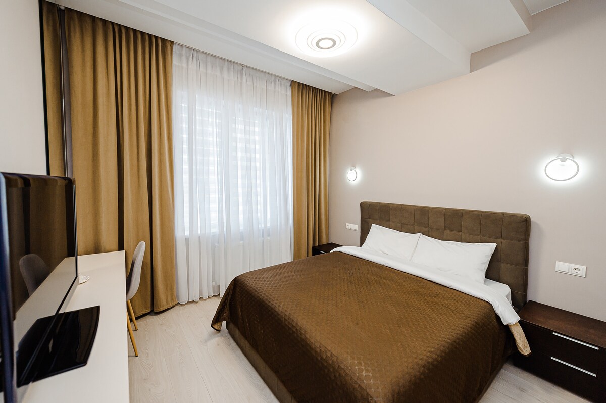 Welcome to GrandStay Apartments, the pinnacle of luxury in Chișinău’s ultracentral heart. This high-end apartment offers floor-to-ceiling glass walls with panoramic views of Cathedral Park, three private balconies, and designer furnishings. Enjoy a premium king-size bed, a stunning in-bedroom bathtub overlooking the park, and a stylish bathroom. A private gym with a city-view terrace and a dedicated concierge complete this exclusive experience.