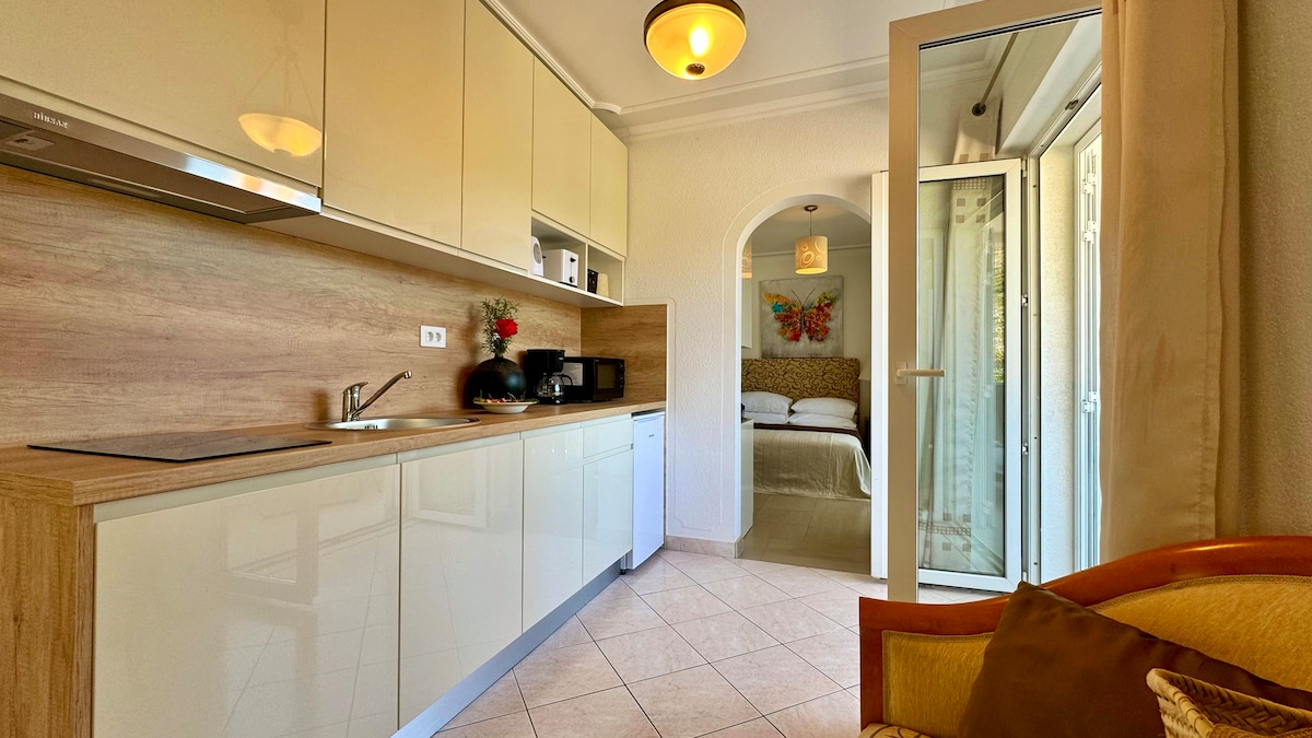 ★ At only 3 min walk from the lovely pebble beach and restaurants, apartment is located in a peaceful seaside area, 10 minute ride from the Old Town of Dubrovnik ★ 26m2. Double bed bedroom, kitchenette with microwave inside of bright, sunlit open space living room. Bathroom with a shower, furnished balcony and shaded terrace. ★Free Private parking in front of the house. ★Apartment is providing all the amenities for the comfortable stay. Free WiFi & Air-con, washing machine, outside barbecue