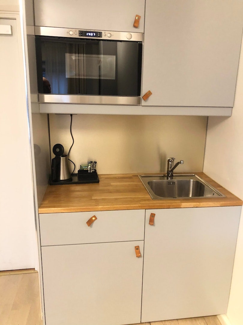Modern aparthotel with gym (free). Breakfast is available as an option and parking is available next to the hotel. Subway is close by and will take you to central Stockholm in 10 minutes. The apartment is new and fresh, 18 sqm. Kitchenette, bathroom with shower and workspace.