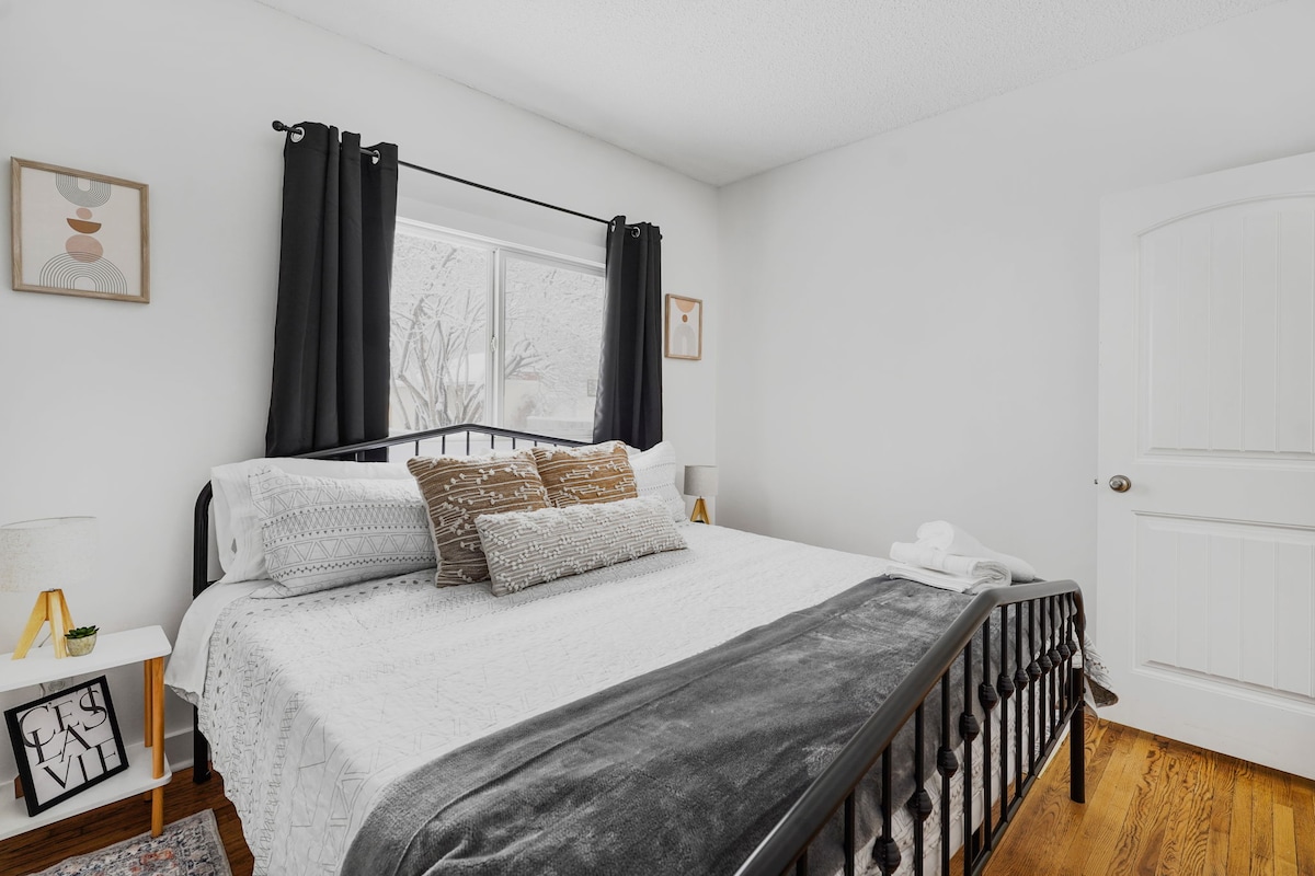 Rustic/modern decor with charm. Cozy master bedroom with king size bed and Smart TV. Two additional bedrooms with queen size beds. Perfect for families! ✧ 1400 sq ft ✧ 8 minutes to downtown core/ICE District ✧ Fully fenced yard with water feature & hot tub ✧ Parking for two + street parking ✧ Smart TV’s/Cable ✧ Keyless entry ✧ Tim Horton’s coffee grounds provided