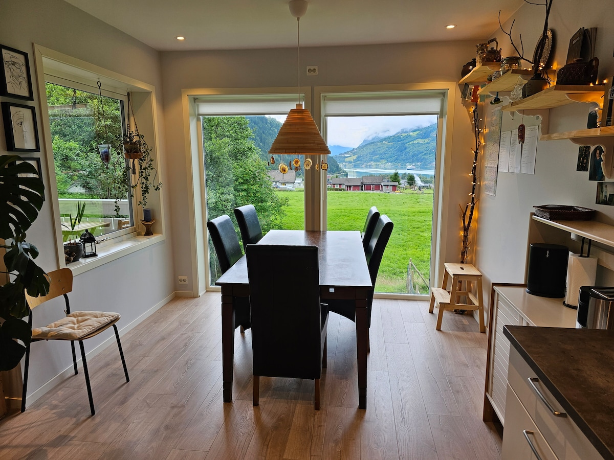 Welcome! 🇳🇴 Newly renovated apartment (May 2025) with beautiful views of fjords and mountains! It is a one-minute walk to forest and nature with nice trails and streams. The apartment is also centrally located, with walking distance to shops, shopping center, football stadium, skatepark, bus station, library, cultural house, playgrounds and more. There is a short driving distance from our apartment to Loen, Lodalen and Oldedalen which has beautiful nature and many exciting experiences! Welcome to us!