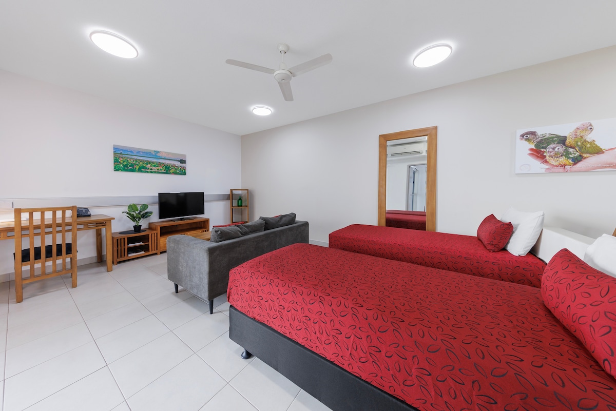 This twin apartment is suitable for up to four guests, featuring one queen bed in the bedroom and two single beds in the living area. A great value option for small groups or families, it offers a private balcony, full kitchen and in-room laundry. Enjoy Foxtel with 115 channels and movies on demand, free WiFi, air conditioning and secure parking, plus access to the 28m climate-controlled pool and gym. Price is based on two guests; additional guests are $35 per night including bedding.