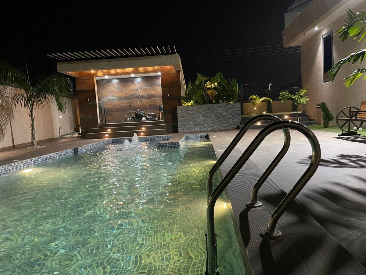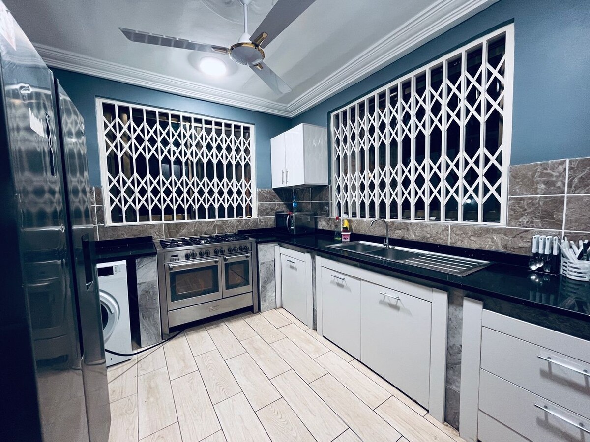 Inside our home, you will be treated to all the luxuries; ● ensuite bedrooms ●spacious open living & dining ●washing machine ●fully equipped kitchen ●all bedrooms and living rooms fully air-conditioned!! ●TV in every room ● Free WiFi ● A secured electric fence ● 24-hour security ● standby generator to avoid any surprises!! ●A car and a driver await you (upon request) to help you explore every part of Ghana ● An award winning chef to take in your orders be it continental or local dishes!!