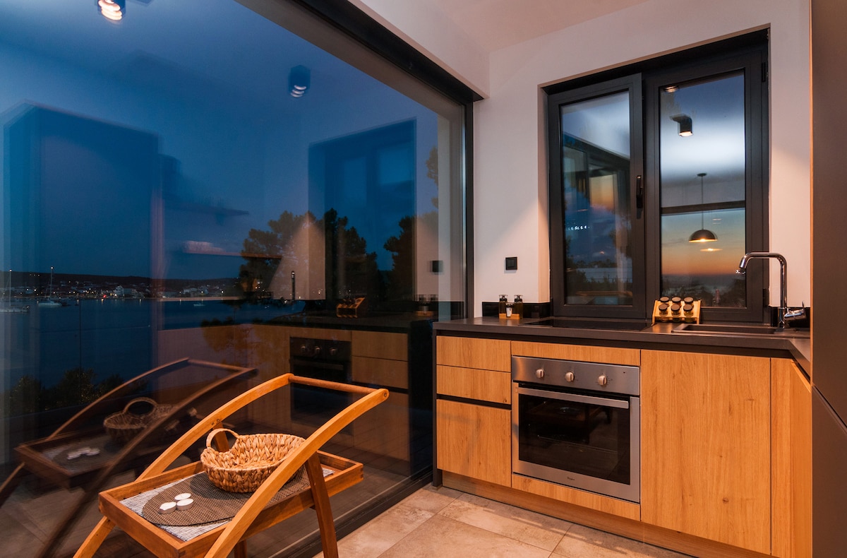 Luxury beach front apartment on 2.floor of new built villa placed directly at beautiful beach in Sukošan. This modern apartment is fitted for up to 4 people. Spacious wood decked balcony provides amazing sea view. This is a perfect gateway for your romantic holiday on beach. Enjoy in warm summer night lazing on loungers, watching shiny stars and listening the sound of sea waves below you.