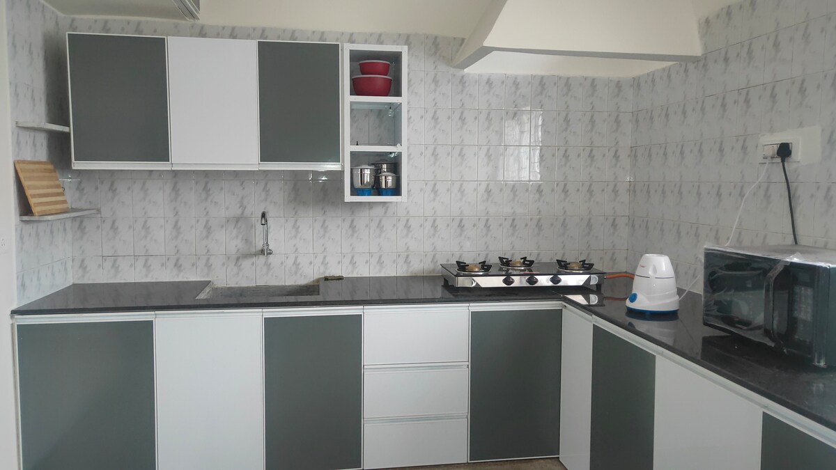 I have for rent a fully furnished house of 750 sq.ft , good for couples/ families (with kids) and business travellers and well-located with grocery/ pharmacies in 200m radius, top-notch restaurants in 2-3km radius and railway station/airport within 5-8km radius. Though breakfast is not provided, microwave and induction stove are available in the apartment with coffee, tea and sugar satchets. Can suggest food delivery services if required. I live next door and am happy to help!