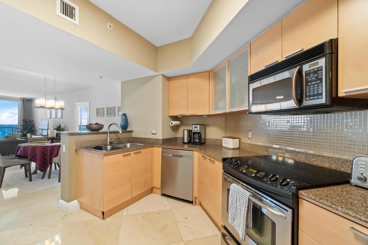 Welcome to our apartment located on the 24th floor of Marenas Resort (950 sq), with private beach access and the best amenities. A unique beach view and a dreamy nighttime panoramic view of the bay. We have a full kitchen (complete dishes), coffee maker, dishwasher, washer-dryer, modern living room with sofa bed, toilet; en-suite bedroom. RESORT FEES PAYABLE AT THE HOTEL FRONT DESK PER NIGHT $49.55 (Beach service, wifi, gym) - $35 valet parking (if you have a car)