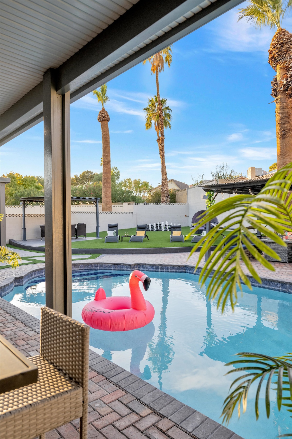 This stylish remodeled home has everything you need for an incredible stay. The comfortable home provides plenty of space for entertaining, dining, lounging, or even just hanging out in the large lush backyard. With 7 beds, the home has plenty of comfortable space to sleep and relax. The whole group will enjoy easy access to everything from this centrally located place. Minutes from the Strip, the Stadiums, and freeway access to get anywhere in town.