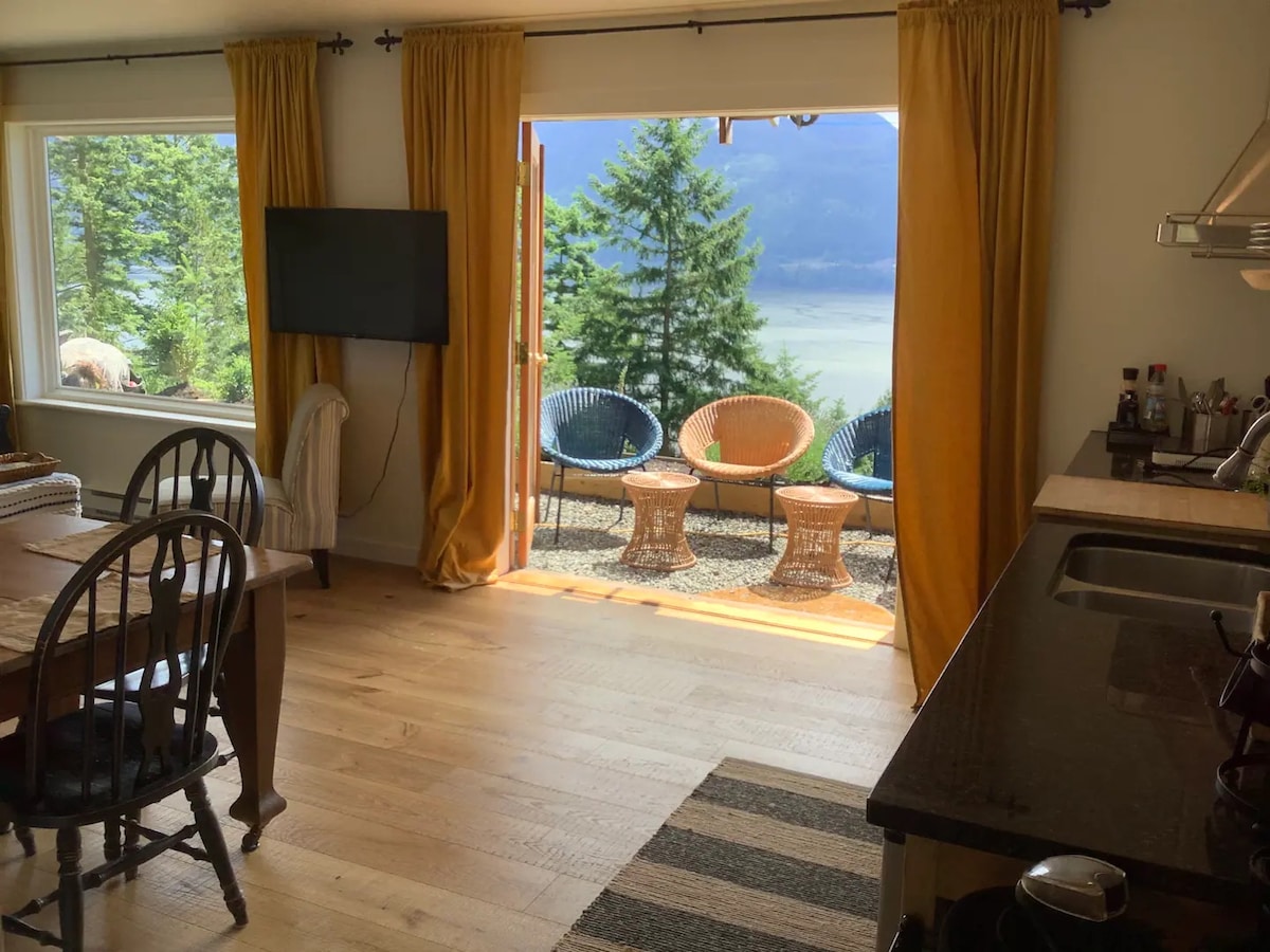 Seas Peace is a welcome respite from city life. Located in lower Gibsons, walking distance to everything you need and things you may not know you need :) It has lovely light, patios for sun, rain, reading, napping as well as indoor comfort. The patios have ocean views, sun, shade and even a firepit(seasonal). This extra large suite has a comfy king size bed, a sofa and reading area, dining area, kitchenette, breakfast area, bathroom and private deck. Private parking incl.