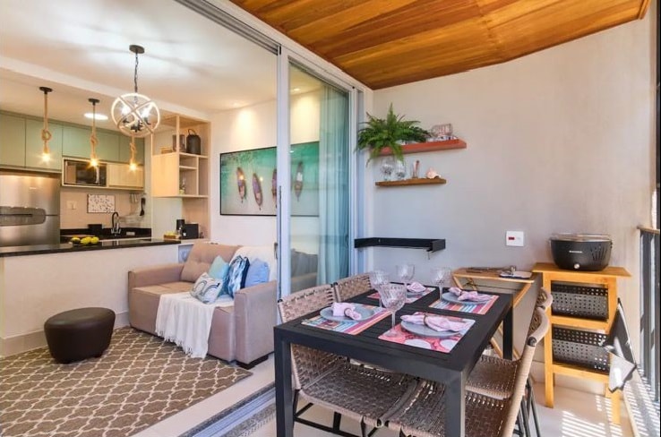Apartment at DNA Ubatuba Reserve, located in front of the large beach. Balcony overlooking the sea. It has two en-suites with air-conditioning and smart TV. Air-conditioning and 50-inch Smart TV in the living room. We also offer a Consul beer maker and an Electrolux water filter. Super comfortable and complete gourmet barbecue for your best stay with your family in Ubatuba. The common area features a heated swimming pool, dry and steam sauna, and a spectacular Jacuzzi and cinema.