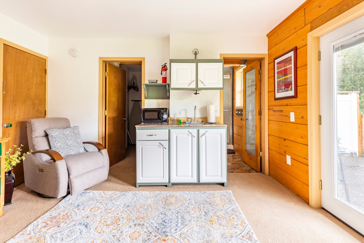Full garden views, bright and modern secluded "guest house" 5 minutes off the highway and 10 minutes from the ferry in western Bremerton. The space is a standalone unit detached from our main house tucked off the main street, nestled amongst the cedars and firs along Mud Bay connecting to Puget Sound. The room has a full 270 degree view on the gardens and trees, queen size murphy bed, fridge, sink, microwave, wood stove and bathroom, complete with 16" outdoor rain shower.