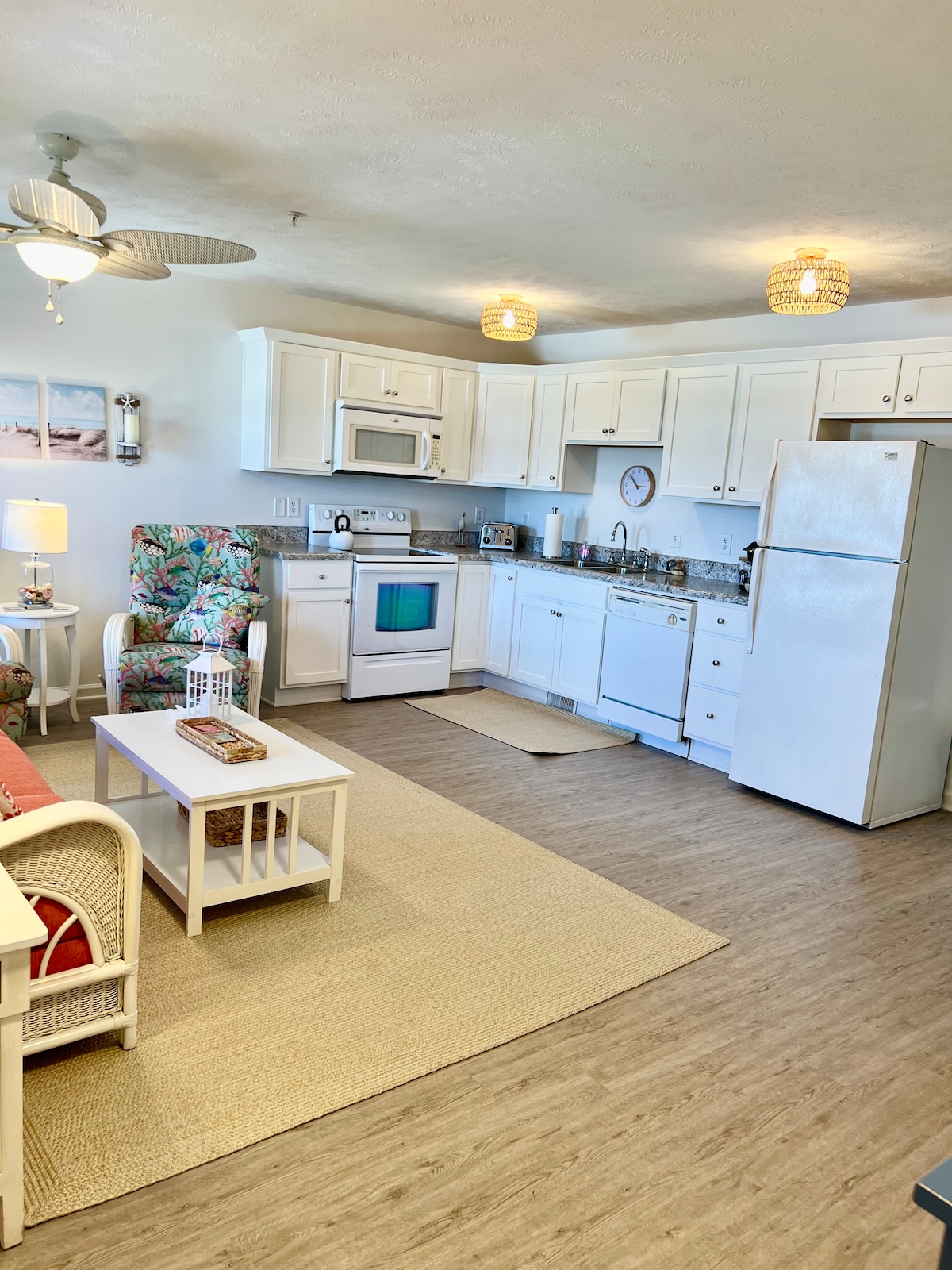 Breathtaking ocean views will help you escape and find relaxation in this end-unit condo. Only feet from the water, you'll be able to embrace the entire sunrise and ocean to yourself! It comes with a king bedroom suite, two single bunk beds, 1.5 baths, and a queen sleeper sofa. Great for couples or those wanting to enjoy the beach with the little ones. Stocked kitchen ready for cooking or enjoy proximity to the many great restaurants in Surf City!