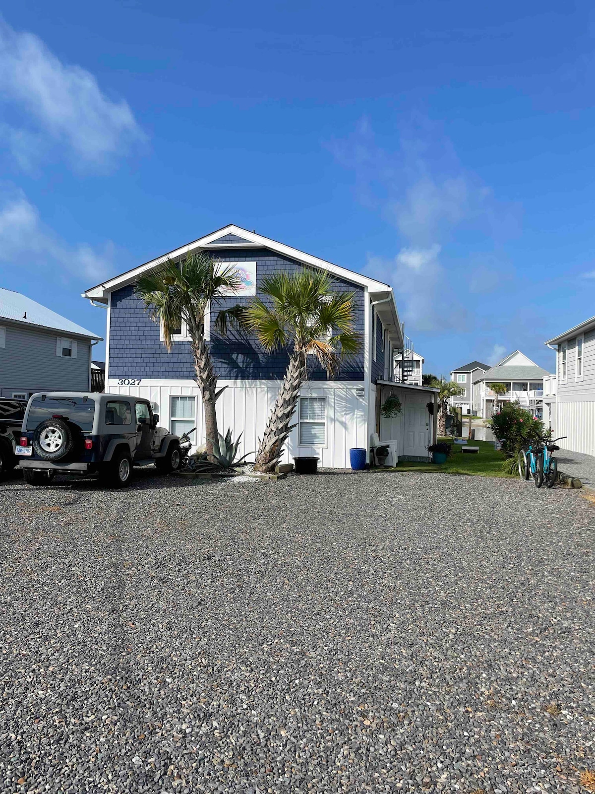 Welcome to "Toes In The Water", our beach home steps away from the beach w/ sound views. This updated house with open kitchen/dining/living room has 4 bdrms, 2 baths, & game room . Outdoor space includes multiple decks & screen porch. Patio has hot tub, dining table & chairs, fire pit & outdoor shower. 1st level is a game room w/ ping pong, darts, & more. Includes beach cart, umbrella, Shibumi, bikes, boogie boards, 2 person kayak, 2 paddle boards, surf board, & Level 2 EV charger.