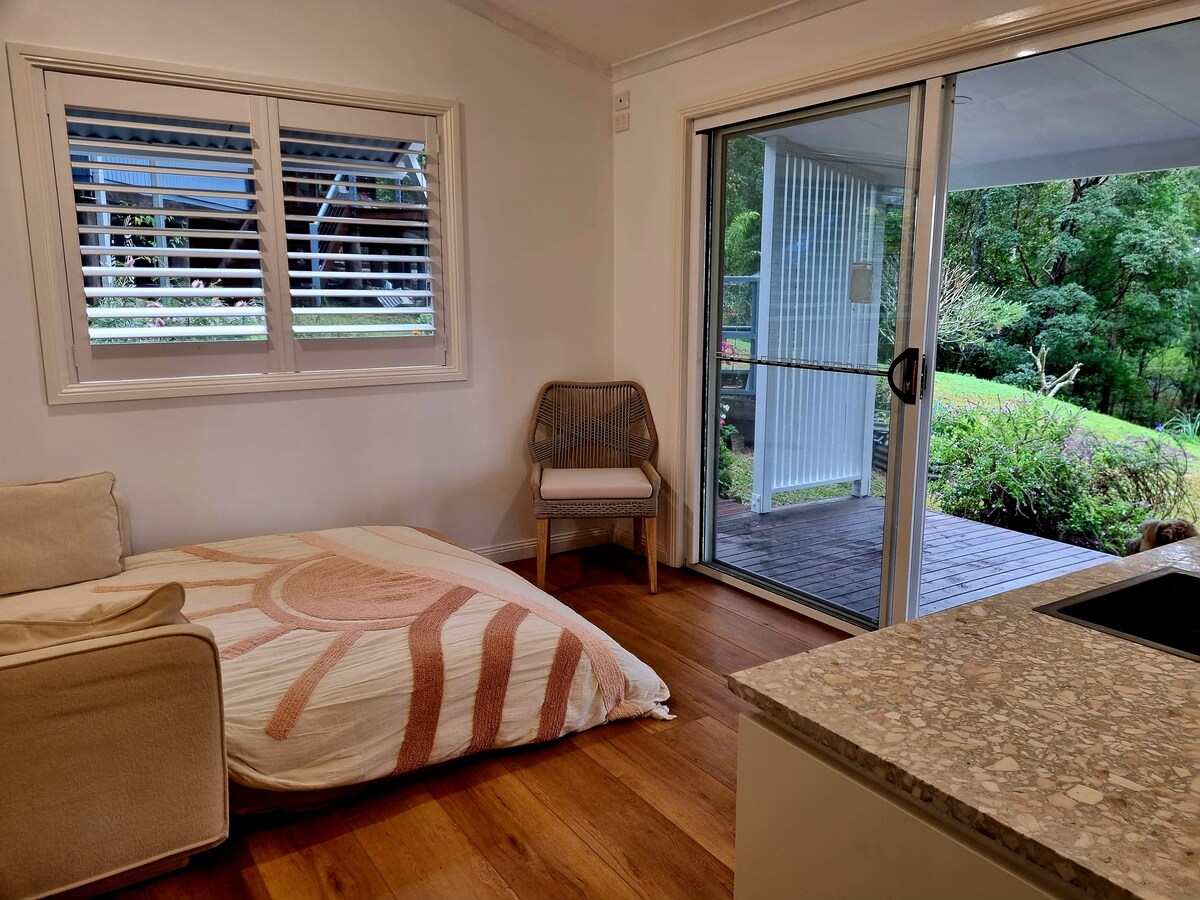 Semi detached studio space with private access, rustic outdoor bathroom and 2 private verandahs. Located in Currumbin waters on a tranquil and quiet 1 acre. A great location to access the beaches, the Valley and local restaurants and cafes. Relax in your outdoor bath overlooking your peaceful surrounds with a glass of wine or a morning coffee. The room consists of a Queen size bed complete with flax Linen bedding, free wi-fi, fridge, toaster, microwave, complimentary muesli, milk, tea and coffee