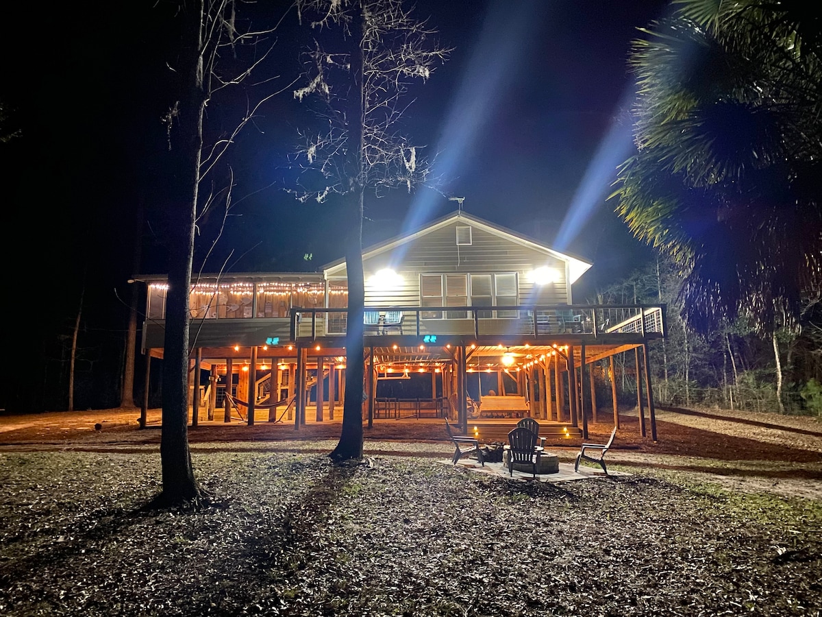 Take some time to relax and watch the river and your cares roll away. Home has high speed fiber internet. The front porch overlooks the Suwannee river and faces west for perfect sunsets while listening to the sounds of nature. This two bedroom one bath cottage has 4 acres of fully fenced land that is yours exclusively. Stroll the grounds and look for deer, rabbit or in the evening lighting bugs. Take a trip to the many springs that the area has to offer for swimming or world class cave diving.