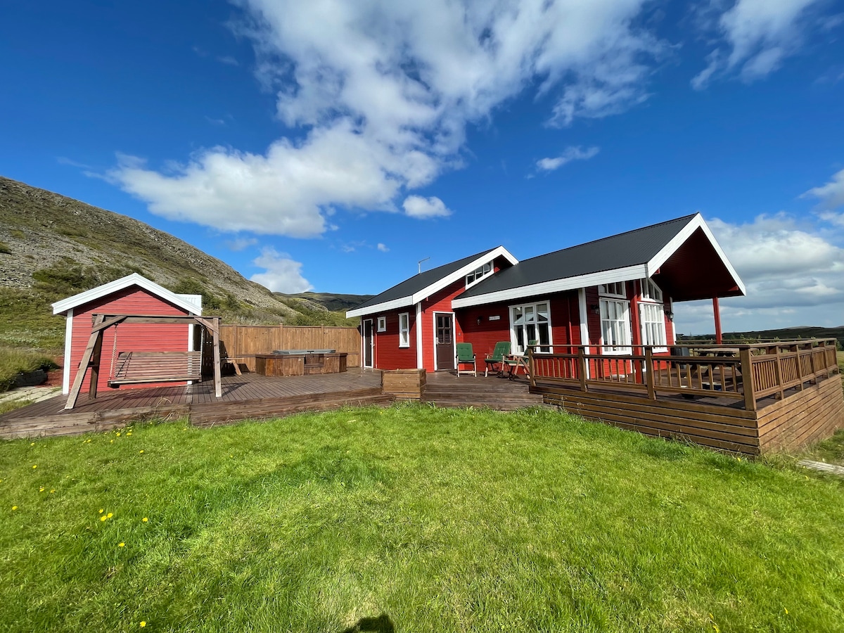 Relax with the whole family/friends at this charming, spacious, newly renovated cottage conveniently located next to the most popular attractions on the south coast of Iceland such as the Golden Circle. Enjoy the mountain views and a gorgeous sunset by lake Álftavatn (Swan lake) that often freezes over in the winter. Relax in the hot tub after a day of exploring and perhaps - fingers crossed - the northern lights will pay a visit :)