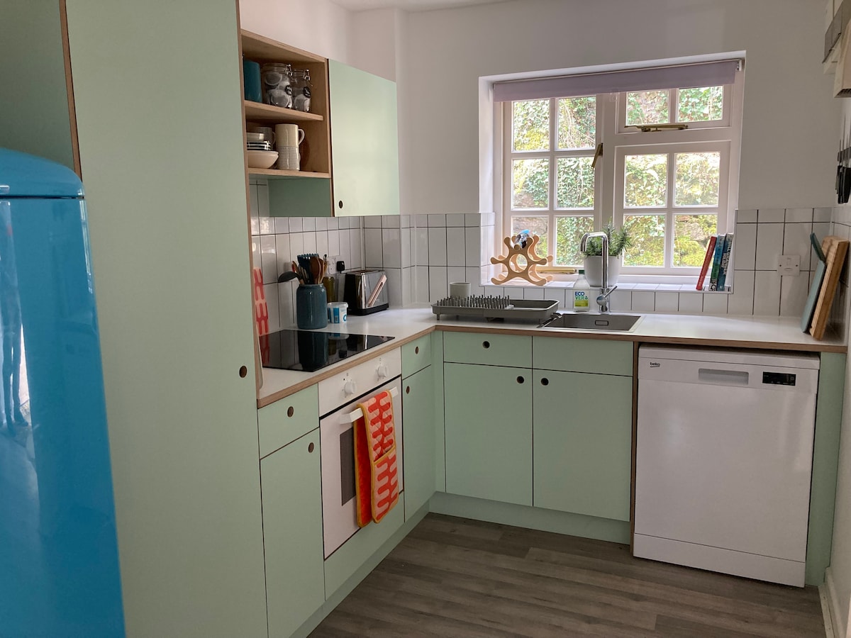 This expertly refurbished 19th-century Coach House is full of character and all ready for your luxurious relaxing break. The open-plan living area has a exceptional view, and when you want a change there's a large smart TV and good-quality broadband for entertainment. The kitchen comes with induction hob and oven, dishwasher and washing machine, as well as all the pots, pans & utensils you need for cooking up delicious meals. The shower room/toilet is conveniently tucked away in a corner. Walk up the distinctive oak staircase to find the upstairs bedroom, with its impressive round window. It sleeps up to three people in a kingsize double bed and a separate single, and there's also room for a travel cot for an infant.The Coach House is ideal for a couple on a romantic escape, or for a family with young children looking for a safe space to relax and play. KEY FEATURES - One bedroom – upstairs, with kingsize double and single bed, space for travel cot. - One shower room/toilet – downstairs. - Sleeps up to three, and infant. - Private outside terrace area with view, shared use of 1.5 acre secure meadow & gardens. - Dogs welcome, two maximum, small additional charge. - Young children welcome (but you may need to bring a stairgate for safety). - Smart TV (Netflix, iPlayer, Freesat etc). - Good-quality broadband/Wi-Fi (free). - Induction hob, oven, microwave, fridge (freezer available if required), dishwasher. - Dining table for four, two leather sofas. - Washing machine (and use of dryer if required). - Underfloor heating (powered by eco-friendly air source heat pumps). - Wood burner, first basket of logs free. The Coach House is bookable by the week (start day Friday), and for weekend and mid-week short breaks.