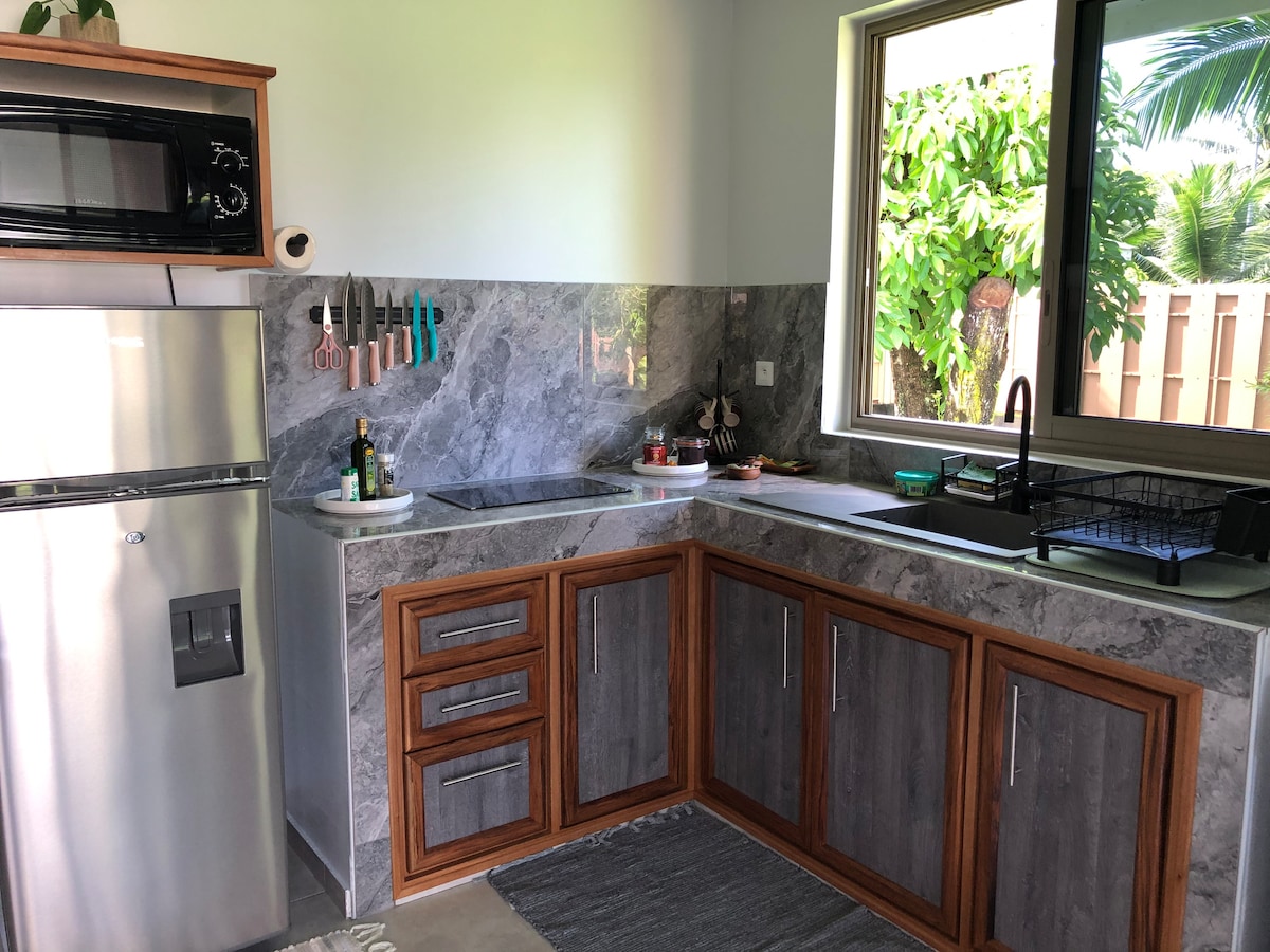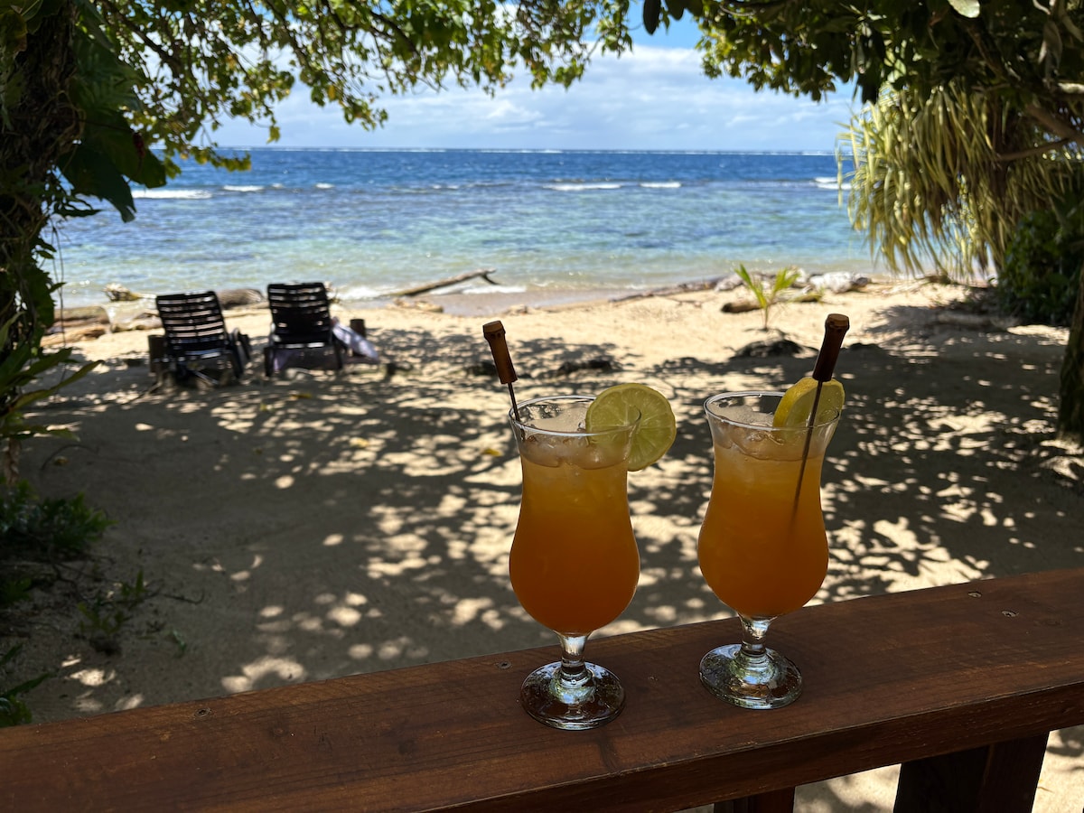 Bungalow duplex indépendant, bord de mer, situé dans une propriété privée. 1 chambre climatisée avec 1 grand lit 2 places + 1 canapé-lit. Un espace cuisine et salle de bain. Terrasse privative exterieure dans jardin bord de l'eau. 2 kayaks à disposition pour accéder au banc de sable à 100 mètres du faré et au spot de surf de Taapuna, à 800 m. Aéroport international /inter-îles à 10 minutes en voiture. Supermarché ouvert 24h/24 à 10 minutes à pieds. Restaurants, snack et roulottes à proximité.