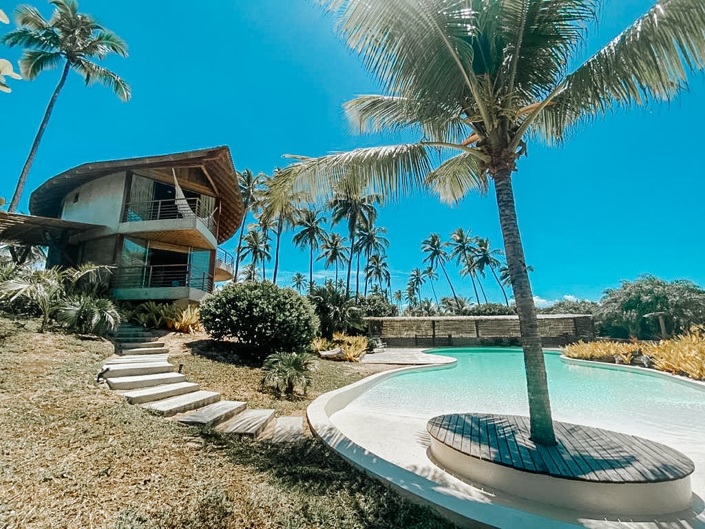 Located within a gated community, facing the sea, on Cassange beach, in a paradise setting, Casa Folha stands out for its distinctive architecture while providing complete visualization of the beach and of the lake-shaped pool, of the coconut gardens and native essences. Ideal space for families and couples seeking harmony and tranquility amidst the exotic vegetation typical of the Bahia coast.