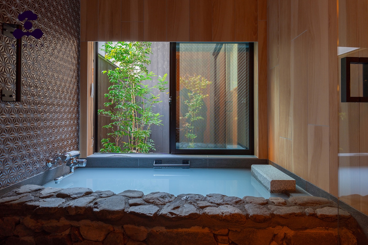 A fully renovated, authentic Kyomachiya with over 100 years of history. The open-air bath featuring a Shigaraki-style tub and adjacent garden provide a feeling of spaciousness. Hana Bamboo Villa is popular with guests for offering an extremely relaxing environment. Original construction materials can be found throughout the property, including the lattices, trusses, beams, and columns. Guests are welcomed with a tasteful exterior and a refined interior featuring a modern Japanese design.