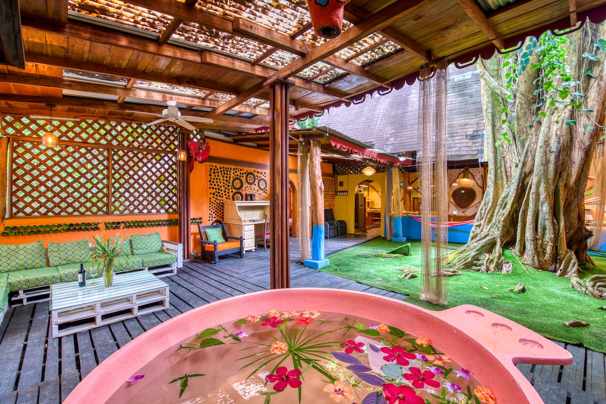 Crystal House. This house is a magical fantasy surrounded by recycled art and nature incorporated. The House has two bedrooms and sleeps up to 6 people. Both bedrooms are equipped with sanitair facilities and downstairs is an extra separate bathroom. One room is airconditioned with 2 queen size beds. The bedroom upstairs has a king size bed, ceining fan, private bathroom, closet. The house comes with a fully equipped kitchen. The Sangrillo tree is the center piece of the house. Around it lays