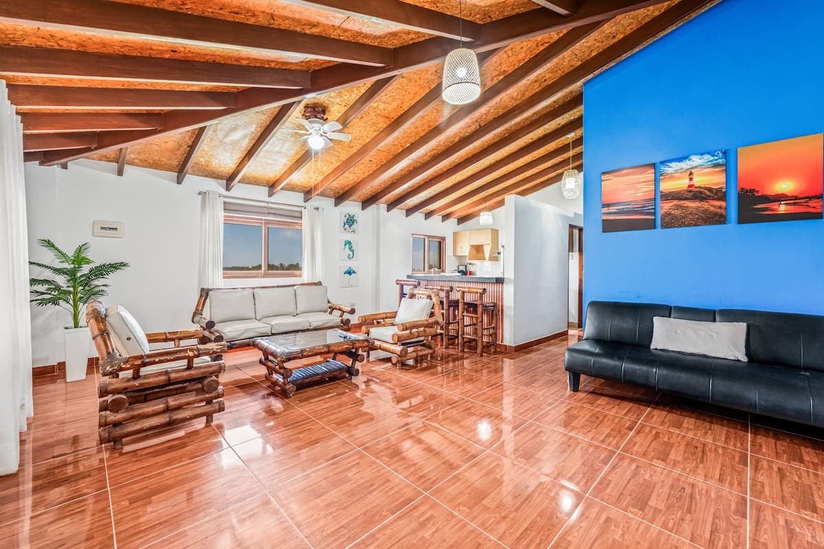 Enjoy one of the best views in Máncora from this spacious apartment with a large private terrace. Located in Las Pocitas a quiet area just 1.5 km from the town center—you’ll have easy access to shops, restaurants, and the lively atmosphere of downtown, while enjoying peace and privacy. Situated in the second beach line, the apartment is just 50 meters from public beach access. You'll also be only 300 meters from Máncora’s official and only sea turtle swimming spot (Nado con Tortugas)