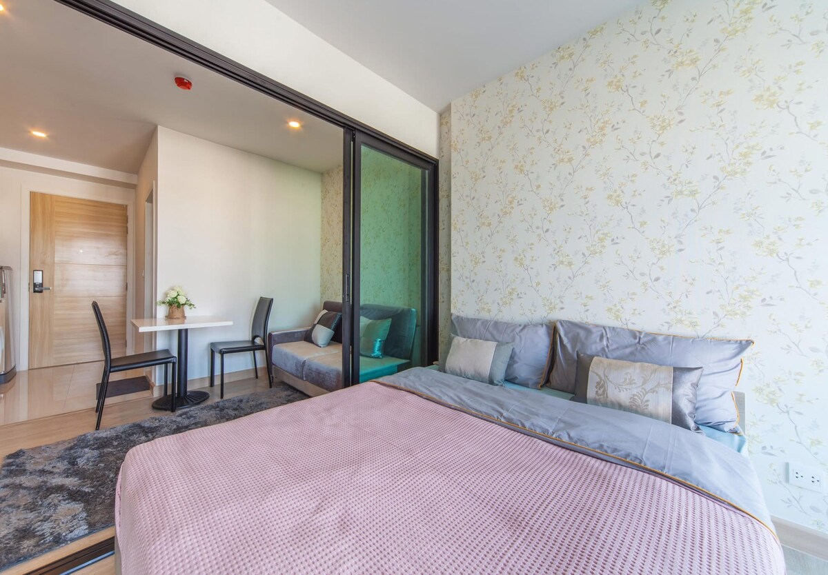 2-bedroom duplex with sweeping panoramic views over Bangkok. Floor-to-ceiling windows flood the space with natural light, while the modern Japandi interior creates a calm and elegant atmosphere ideal for couples, families, or business travelers. Fully equipped kitchen, spacious living area with a 65” smart TV & private balcony. Direct access to a gym and wellness spa on the same floor, plus a rooftop sky pool and sun deck above. Food hub, cafés, and a 24/7 Mart are located inside the building,
