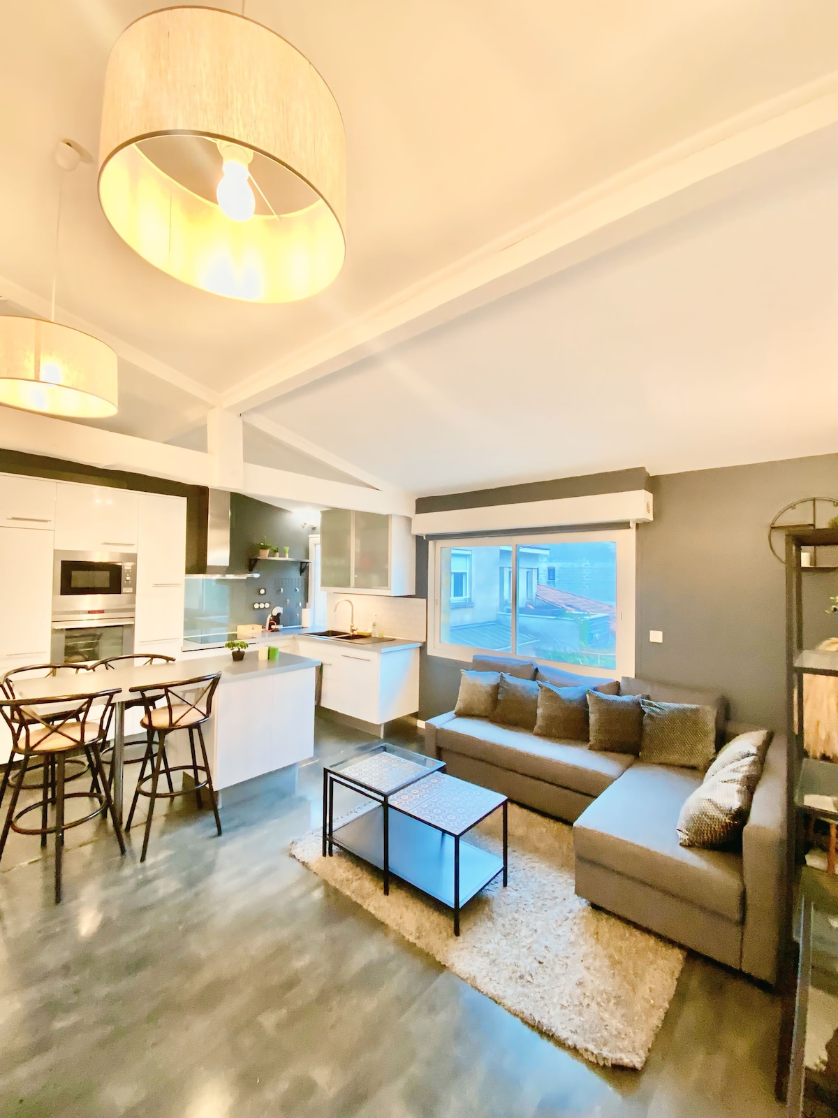 On the first floor of a pretty town house, this beautiful duplex apartment will seduce you with its large spaces, its magnificent terrace (25m2) completely private and sunny, its level of equipment and comfort, and its stylish decoration. It is the perfect place to discover Bordeaux, 2 tramway stations from the Place de la Victoire, and 4 from the Cathedral.