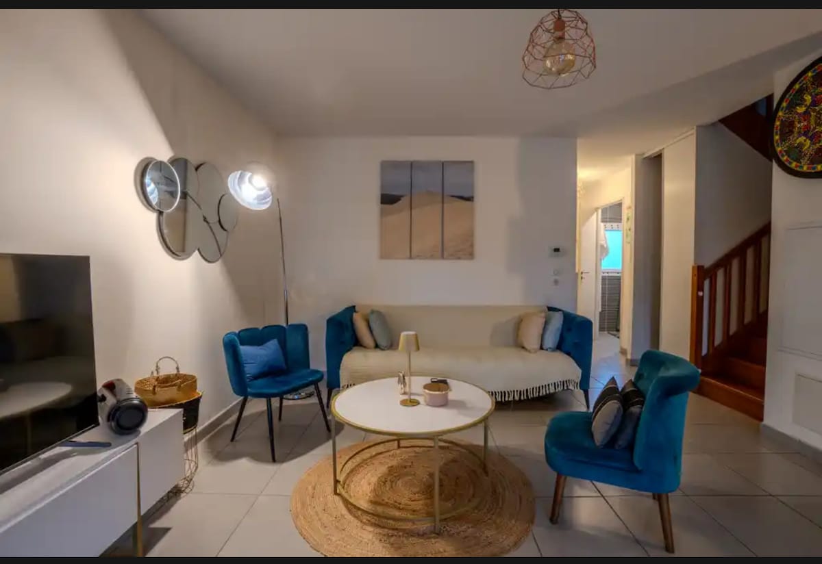 Charming house with private terrace and individual entrance. Ideal for 1-4 people, cozy and elegant, offers a mezzanine with a double bed and a comfortable sofa bed. Just 5 km from Mérignac Airport (transfer possible), it's ideal for exploring Bordeaux (15 min by tram), its famous vineyards and ocean beaches. Bus stop – 2 min, tram – 15 min walk. Enjoy a complimentary light breakfast, a quiet and green setting, and free street parking.
