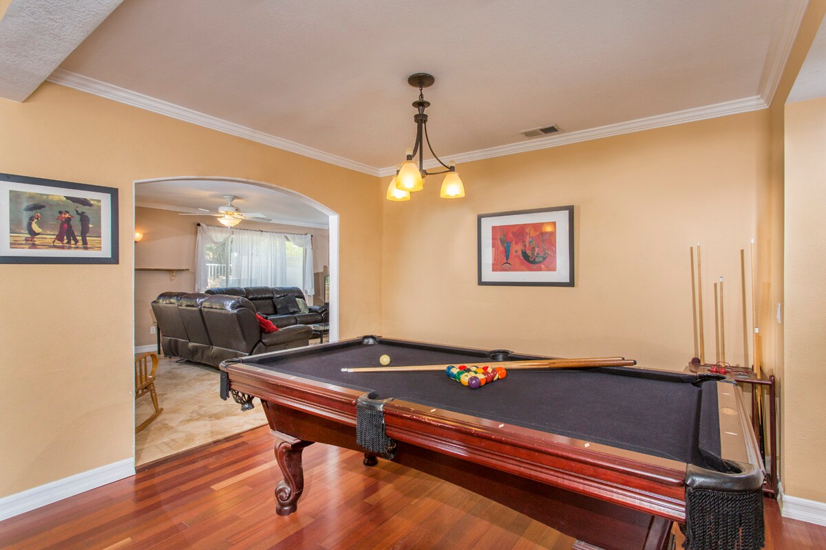 Resort style family friendly home close to beach (only 3-5 miles away!) with salt water pool and large hot Jacuzzi. Spacious backyard and patio with gas BBQ for grilling. Open concept living areas, stocked kitchen with everything you need and spacious bedrooms. Beach gear provided for your beach days. Central AC/Heat to keep you comfortable, board games ready to be played and a fantastic family size couch to watch TV. Desk area for remote working. Your family & friends getaway is ready for you!