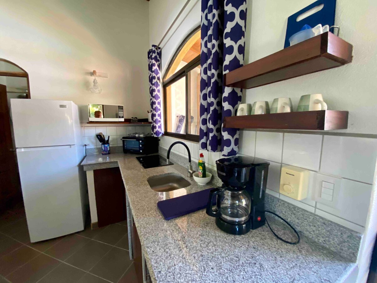 Experience a cozy stay in our fully furnished studio apartment, just 10 minutes from Tamarindo! Enjoy a spacious balcony, a king-sized bed, modern showers, and a fully equipped kitchen. Located in a quiet, gated complex, we offer parking, cleaning, and laundry services. Relax by the large saltwater pool and unwind in the rancho area. With the owner on site and three rentals available, you’ll feel right at home close to beautiful beaches. Book your stay today!