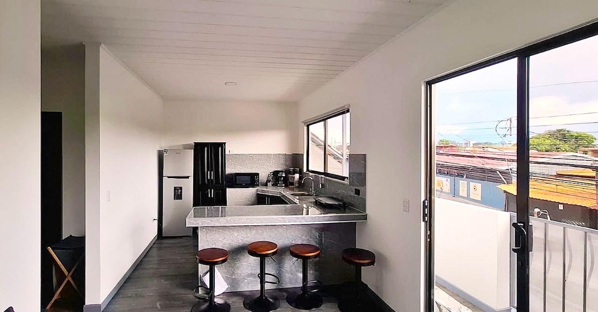 Experience a cool, light-filled retreat in Alajuela. Enjoy the view with a coffee or a drink from a large terrace facing the mountains. Just 5 minutes from downtown and 12 minutes from the airport (variable travel time). This space offers comfort in the room, a large living room, and an equipped kitchen. It also has a comfortable bathroom, parking, and the possibility of laundry service at an additional cost. Your pets are welcome to enjoy the experience with you.