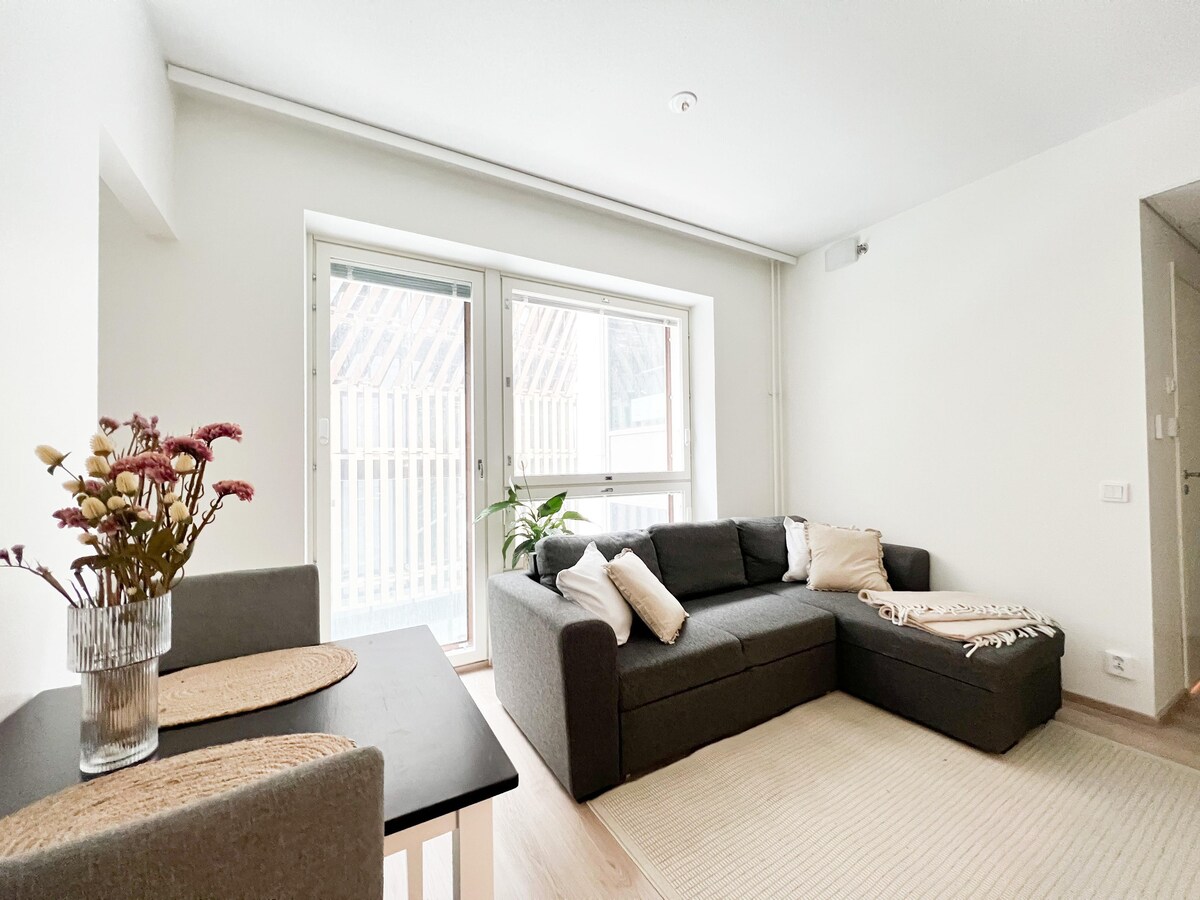 As far as locations go, it doesn't get much better than this! The studio is located in the heart of the city center, just a few steps from Nokia Arena - and you can park your car in the garage directly below the building. This second floor apartment's interior is designed to give a hotel room vibe, and the big, comfortable bed guarantees a good night's sleep. The studio features a large glaced balcony, a portable air-conditioner and a full-size bathroom with a washer. Welcome 😊