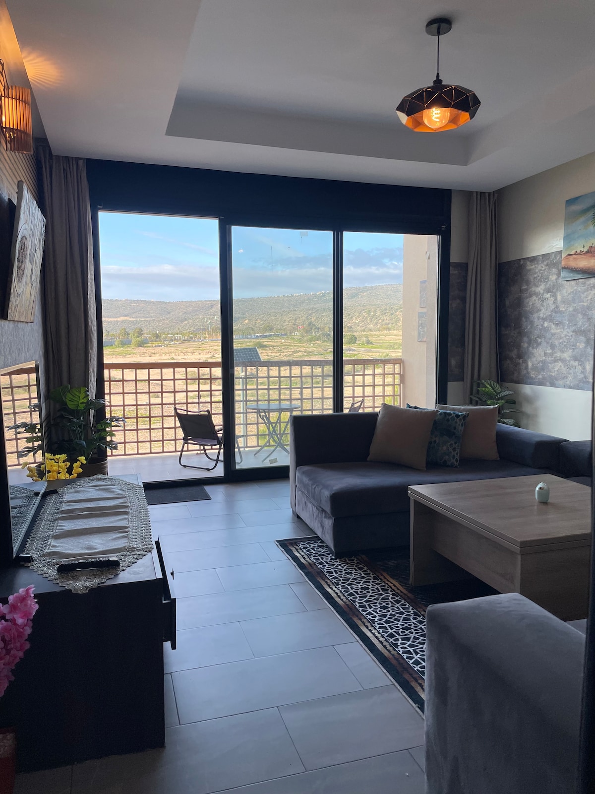 beautiful bright single-story apartment, located on the ground floor in a brand new residence in the heart of Taghazout Bay with: - walking distance to the beach 10/15 min. - 4 swimming pools (including 2 for children). - free parking. - 24/7 security. composed of a bedroom, American kitchen, 2 bathrooms, living room, dining table and a balcony with green space. ideal for families, golfers, surfers and sun and beach lovers.
