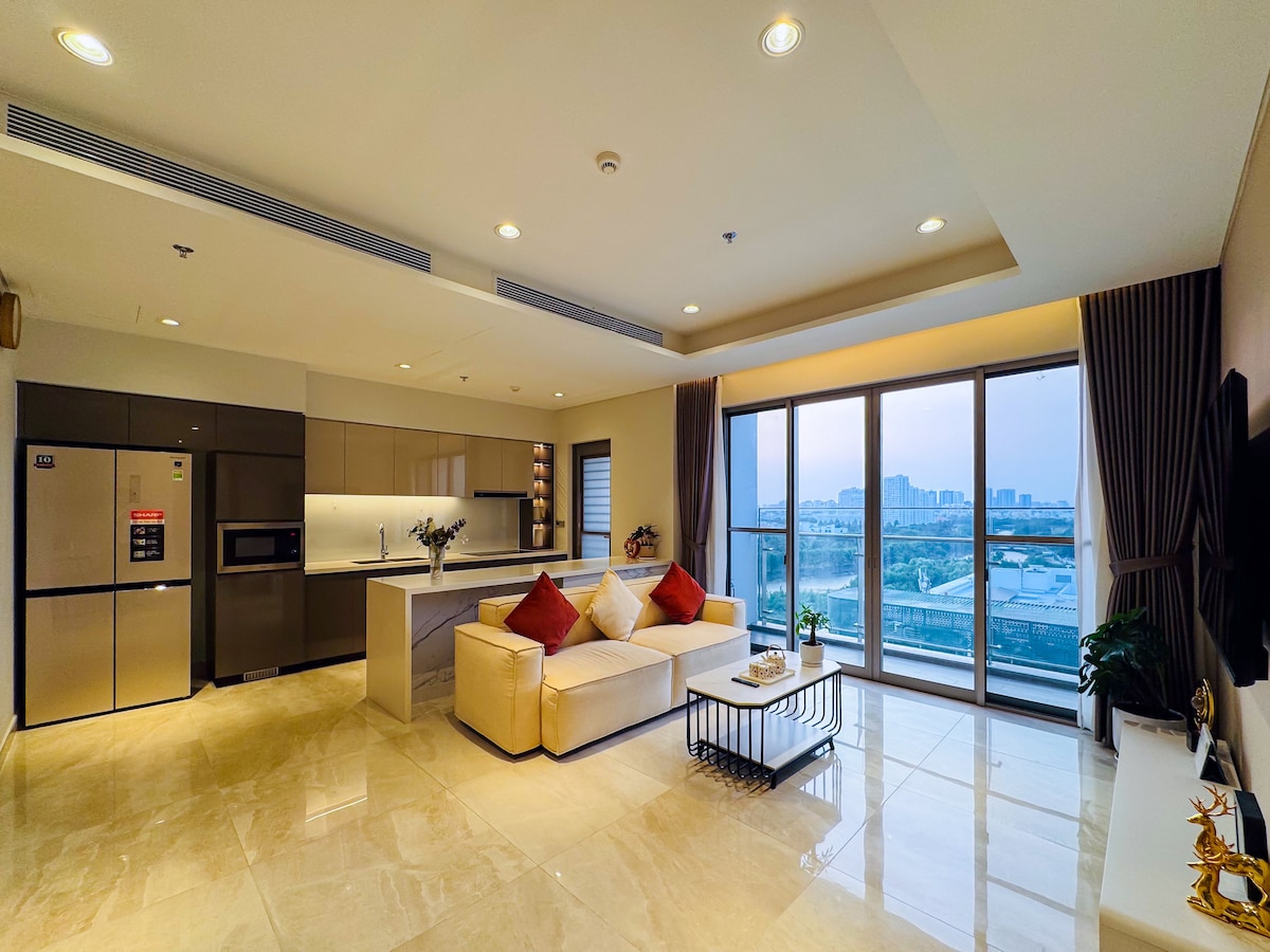 This is a spacious 3-bedroom apartment with refreshing green views, located in a high-end apartment complex with 2 swimming pools and a wealthy community, opposite Lotte Supermarket and just a 15-minute taxi ride to the center of District 1.