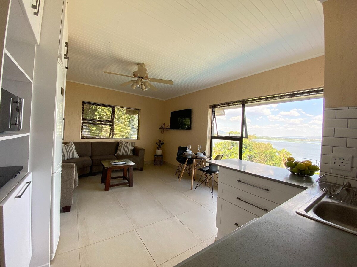 Unit 1 is a Luxury apartment suitable for 2 guests (unfortunately no children) with amazing views over the dam. There is one bedroom fitted with a queen size bed and en-suite bathroom with 2 showers and a Jacuzzi bath and fully equipped kitchen. The unit is not wheelchair friendly, as there is a step leading to the bathroom.