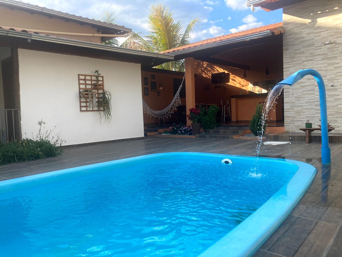 House in a gated community. Swimming pool with waterfall, illuminated and with hydro. Living room with sofa/bed, armchairs, 85-inch TV, dining table (6 seats) and toilet. Electric curtains with pool view. 4 luxury lounge chairs. Outdoor sofa and chaise. Outdoor bathroom. Outdoor shower. Kitchen utensils/appliances. Barbecue grill. Hammock. Trampoline for children. Suite 01: TWO full beds Suite 02: ONE double bed + one single bed Both with air conditioning. Perfect view.