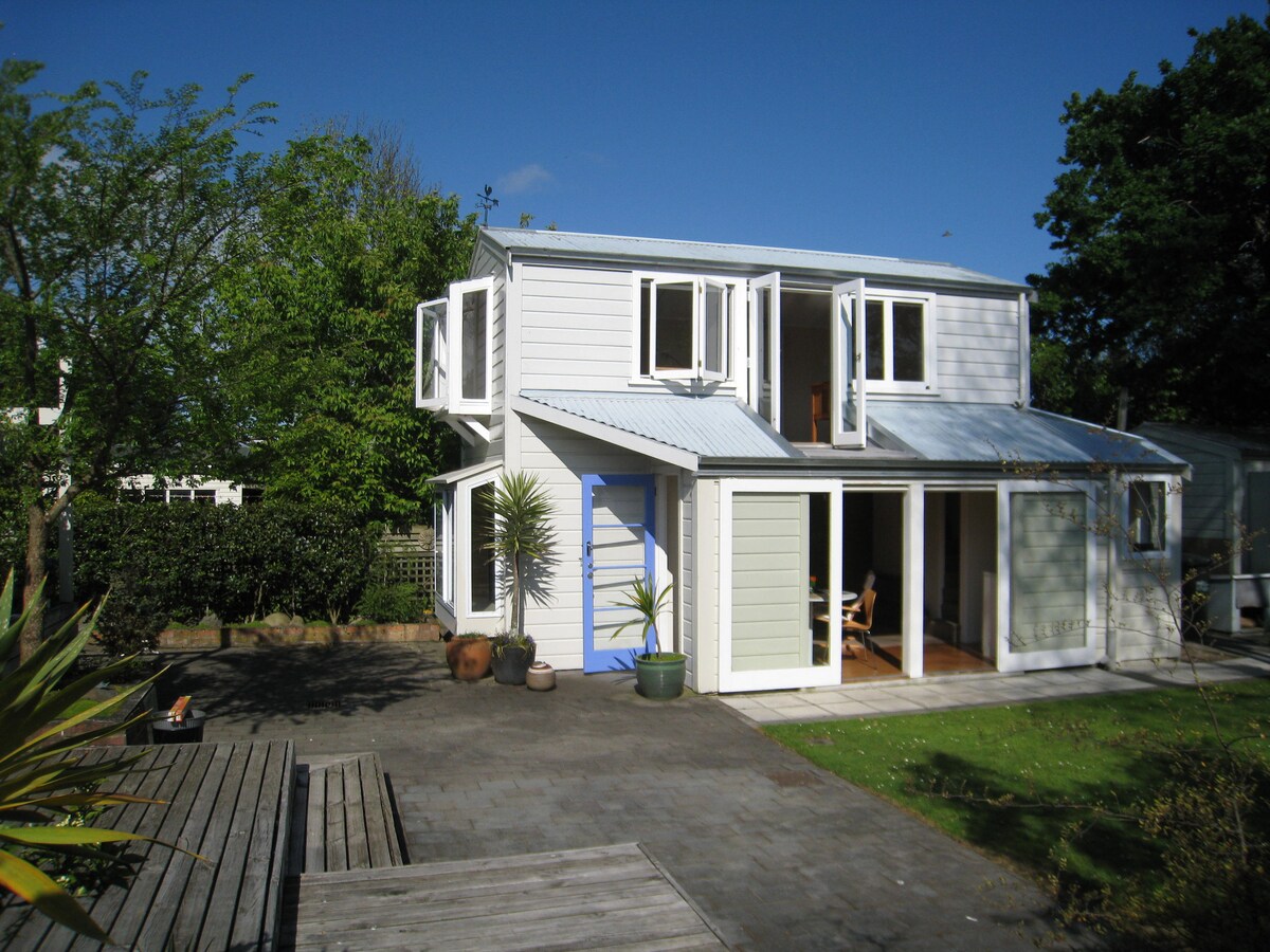 Two-storey studio set in peaceful rear garden of hosts' home. Self-contained & fully equipped, 2kms to airport, 1km to hospital, 4 kms to the Square. and 6kms to Massey University and the Science Centres. Off-Street parking. Free pick-up and return to airport. Can accommodate up to 4 people, 1 Queen bed + 1 single bed upstairs, 1 ottoman single bed in Living Room. By prior arrangement extra bed (1) may be provided.