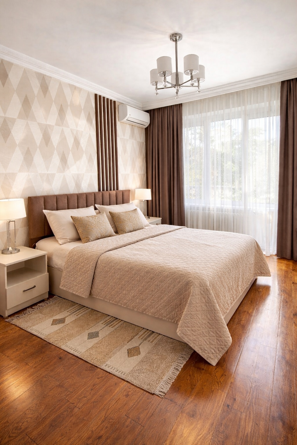 Bright and cozy modern apartment in the center of Bishkek, located in a quiet green courtyard. Fresh renovation, natural wooden floors, new furniture, and modern appliances create a warm home like atmosphere. One bedroom with a walk in wardrobe, living area, and fully equipped kitchen. Orthopedic mattress, fast Wi Fi, cable TV, air conditioning, and a comfortable workspace. Open balcony facing a green yard and a loggia on the opposite side. Self check in via secure lockbox. Ideal for your stay.