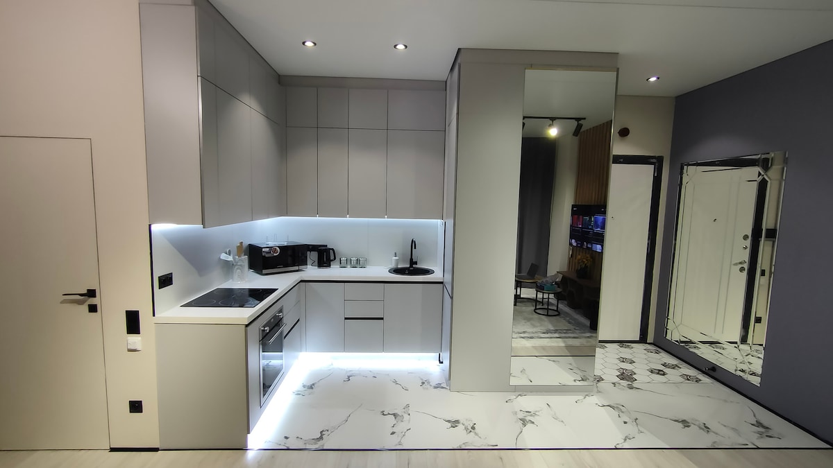 This stylish studio with panoramic windows and unique design will give you a feeling of comfort and freedom. A spacious living area, a comfortable bed, a fully equipped kitchen and a modern bathroom - everything for your convenience. The apartment is bright and cozy, ideal for relaxation or work. Wi-Fi, TV and air conditioning are available throughout your stay. 24-hour contactless check-in is provided!