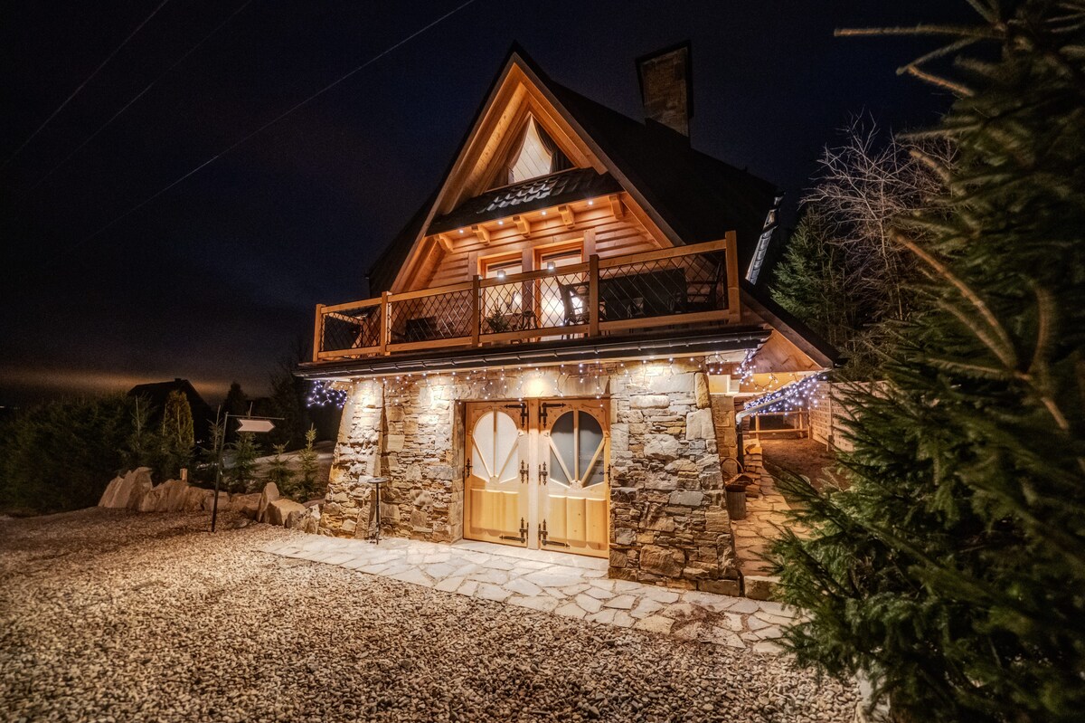 Luxury cottages with an unearthly view of Zakopane and the Tatra Mountains. Located in Ząb - the highest village in Poland. The cottages are fully equipped. Living room with lounge, kitchenette, bathroom and two bedrooms upstairs. The cottages are decorated in a highlander style, with an electric fireplace. The Kasprowy cottage has a huge terrace with a hot tub and warm water. There is also a separate barbecue house with a fireplace.