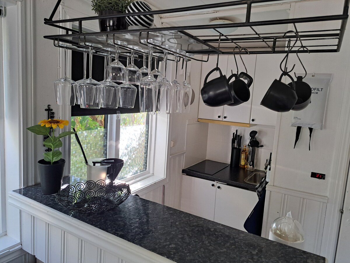 Newly renovated in 2024, now with high ceilings and an indoor shower. Cozy soldier's cottage about 25 m2. One room with 2 beds plus 1 bed sleeping loft, Toilet, shower. Kitchen with dining area. The kitchen has a fridge/freezer, stove and oven, microwave, coffee maker. The cottage is cozy, a little remote on a villa plot with a nice fruit garden, Fun, a little unusual plants in the garden. About 1.9 m ceiling height in the kitchen. Other spaces with high ceilings. 2-3 minutes walk to pizzeria and shop (ÖoB). Grocery store 2 km. 3.6 km to Färjestaden. 3.8 km from Ölandsbron.