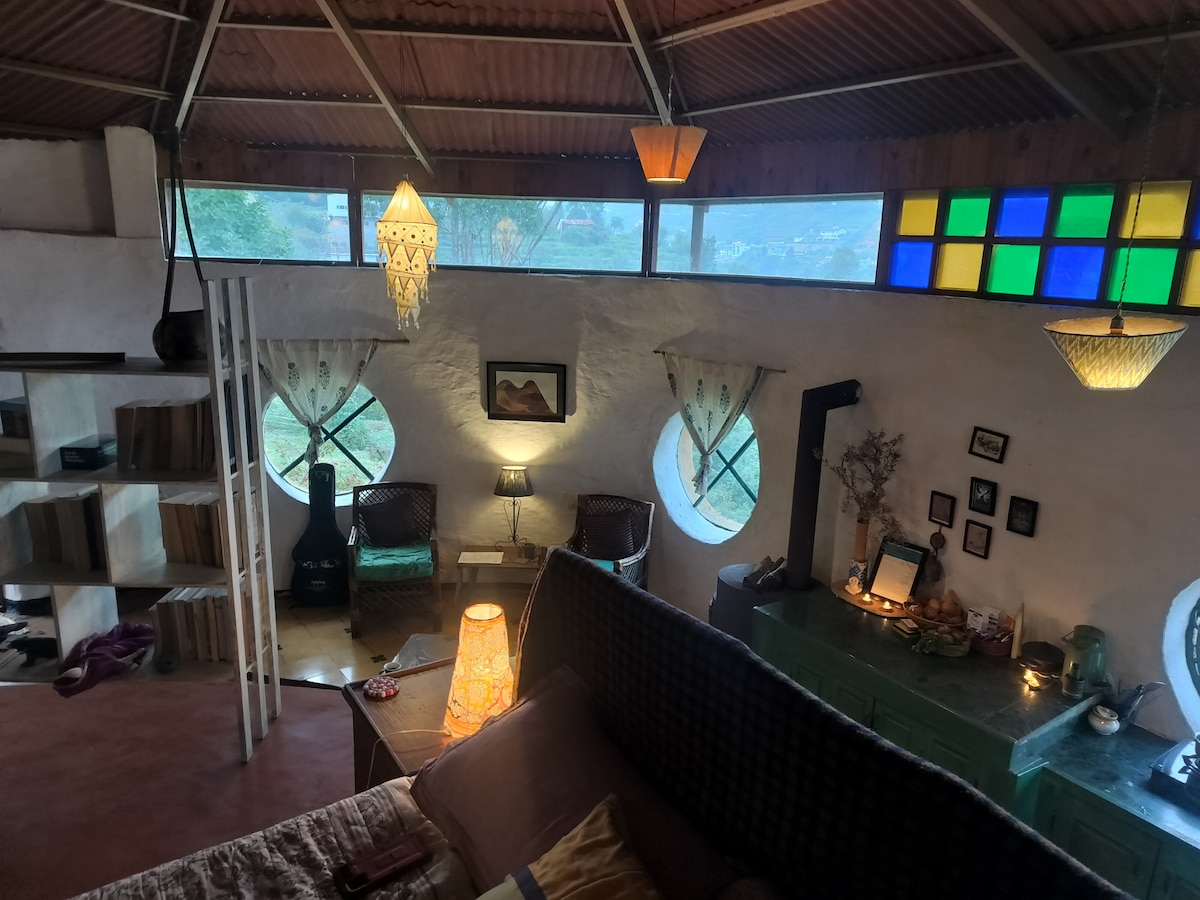 This A-frame, 3-bedroom house is on a quiet street in Vilpatti, just 6 km from the central Kodaikanal. With nearly three-quarters of the front built with glass, the living room offers amazing views of the serene mountains. The house features a beautiful, extensive patio, a mini library, comfortable work seating, and a fully functional kitchen, making it perfect for families with kids. The sunrise view, with rays falling on the mountains, is best enjoyed from the first floor.
