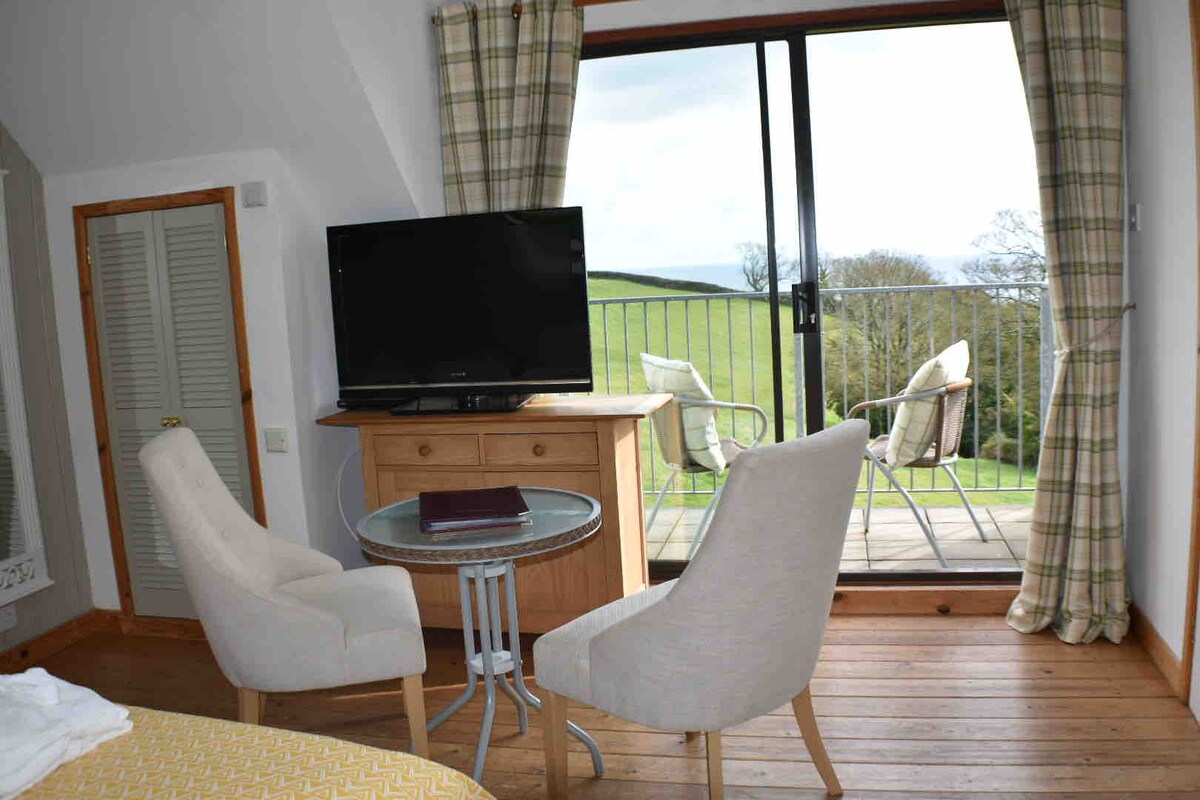 The Studio is an oasis of calm & tranquillity with direct views to the sea. 30 metres to Coastal Path & only 10 minutes drive from the Dartmouth. After a day out exploring, come home to your Light & airy private studio residence with Balcony Double bed with comfy linens En-Suite Power Shower Kitchen with Fridge/Freezer, Oven, Hob TV/ DVD & Sitting Area Complimentary Tea/Coffee Walking distance to TWO beaches 3 minute walk to the Laughing Monk (winner best restaurant in Dartmouth)