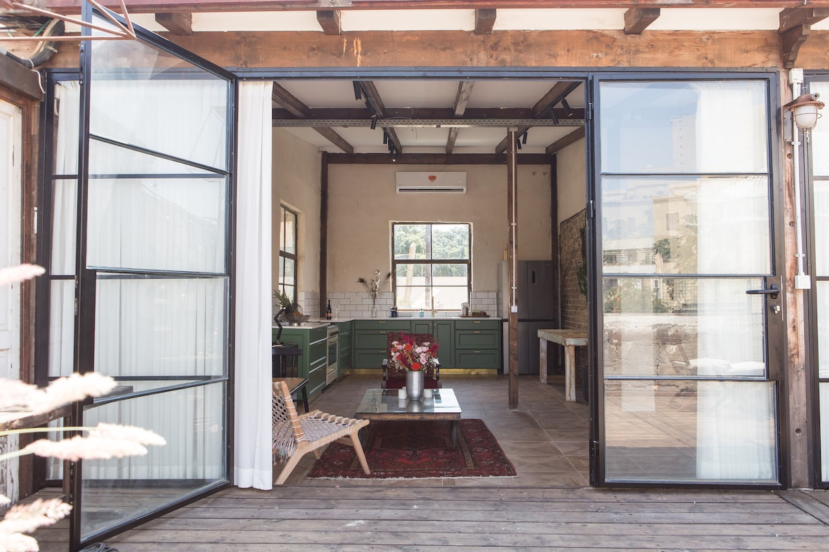 A newly renovated 2 bedroom gallery apartment in a historic restored building “Beit Ne’eman” (1920). The apartment is tucked away in a quiet pedestrian street (no cars allowed) right in the heart of Tel Aviv (also known as the UNESCO White City).