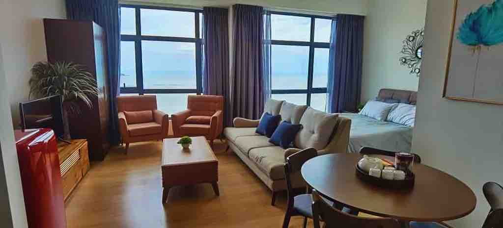 You can enjoy peaceful seaview from our room. This resident shares same facilities with 4 star Swiss Belhotel and is very close to Ana Ikan Bakar Petai (walking distance) and KPJ Pahang. Studio included Coway Water Filter, wifi, Netflix, Android box, 2HP Aircond, queen size sofabed, mini fridge, 60 inch flat tv, microwave, steam iron, water heater, hairdryer, cutlery set & 2 towels. RM 100 security deposit will be refunded within 48 hrs after checked out. This room is strictly for 2 guests only.