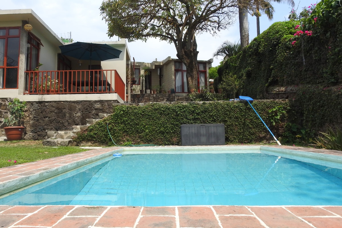 Come and enjoy Cuernavaca's weather. Beautiful bungalow located in a residential zone, only 3 minutes away from Downtown. It's an independent bungalow, inside a property where there's a house. In common areas there's a pool, private parking, high speed WiFi and an unbeatable view. Garden and pool areas are private, exclusive for you and your companions. Pool does not have heater. This place is great for those who want a private, quiet space to relax.