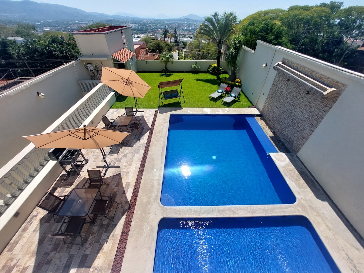 Hermosa casa al sur de Cuernavaca con hermoso y amplio jardín, alberca y chapoteadero con calefacción solar privados, llega de 18/25 grados en invierno y en verano entre 28/34 grados; reja para seguridad de niños y mascotas. Palapa con smart TV de 55”, con asador, horno y amplios espacios para que puedas disfrutar con familia y/o amigos. Estacionamiento privado para 5 autos. Baños con iluminación natural y baño principal con Jacuzzi privado. Ven a relajarte y disfrutar del clima y naturaleza
