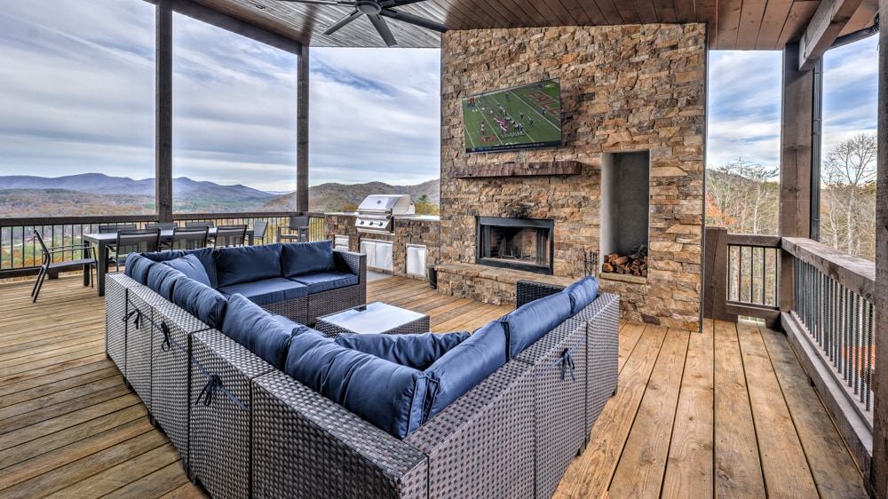 Experience the ultimate mountain escape at BLUESTONE, the highest residence in the Aska Adventure area. Nestled at 2,200 feet above Lake Blue Ridge, this stunning retreat offers 180-degree views of three states and the National Forest. Enjoy luxurious indoor-outdoor living with elegant spaces, a gourmet kitchen, and an outdoor kitchen. Relax in the hot tub, gather around the stone fireplace, or sip coffee on the porch as deer roam nearby. BLUESTONE is perfect for all guests. Book today!